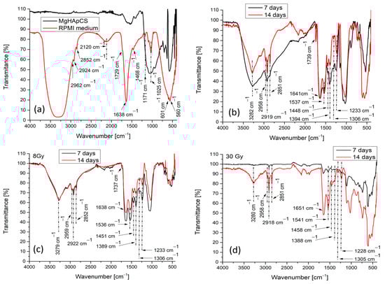 FTIR spectra: (a) MgHApCs layers (black line) and RPMI medium (red line); (b) MgHApCs-7D (black line) and MgHApCs-14D (red line) samples; (c) MgHApCs-8 Gy-7D (black line) and MgHApCs-8Gy-14D (red line) samples; (d) MgHApCs-30 Gy-7D (black line) and MgHApCs-30 Gy-14D (red line) samples.