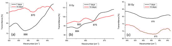 FTIR spectra in 950–800 cm−1: (a) unirradiated layers; (b) 8 Gy irradiated layers; (c) 30 Gy irradiated layers.