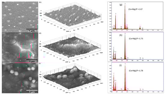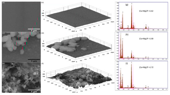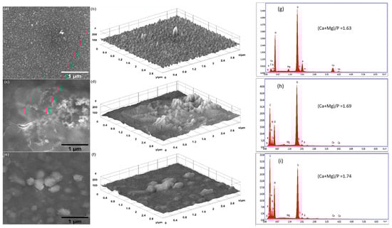 SEM images: (a) MgHApCs, (c) MgHApCs-7D, and (e) MgHApCs-14D layers. Three-dimensional surface plot of SEM images: (b) MgHApCs, (d) MgHApCs-7D, and (f) MgHApCs-14D layers. EDS spectra: (g) MgHApCs, (h) MgHApCs-7D, and (i) MgHApCs-14D layers.
