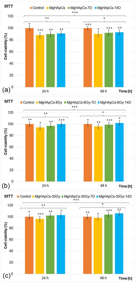 MTT assay of MG63 cells incubated for 24 and 48 h: (a) MgHApCs layers unirradiated and immersed in RPMI for 7 and 14 days; (b) MgHApCs layers irradiated with 8 Gy and immersed in RPMI for 7 and 14 days; (c) MgHApCs layers irradiated with 30 Gy and immersed in RPMI for 7 and 14 days. The results are represented as mean ± standard deviation (SD) and are expressed as percentages of control (100% viability). The statistical analysis was conducted using one-way ANOVA. The p-values indicated are the following: * p ≤ 0.03, ** p ≤ 0.002, and *** p ≤ 0.001.
