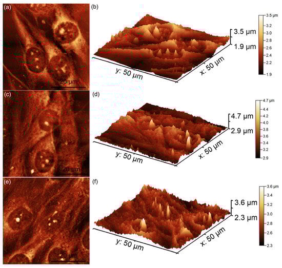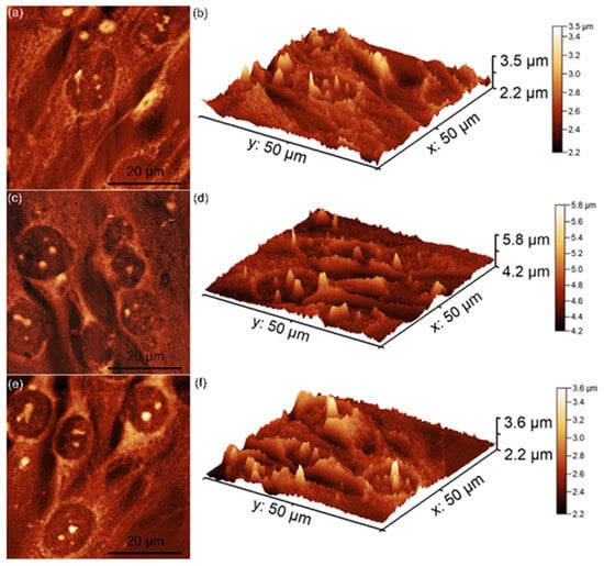 As demonstrated in previous studies by Knápek et al. [,], AFM non-contact mode allows reliable and non-destructive surface analysis. The 2D AFM topographies revealed that MG63 cells adhered to all tested surfaces after 48 h of incubation. However, some minor morphological differences were observed based on the irradiation dose. On the unirradiated and 8 Gy-irradiated MgHApCs layers, the cells displayed elongated and well-oriented morphologies, indicative of healthy fibroblastic-like MG63 cells. These findings suggest that the surfaces provided favorable conditions for MG63 cell attachment and development (Figure 8a–f).