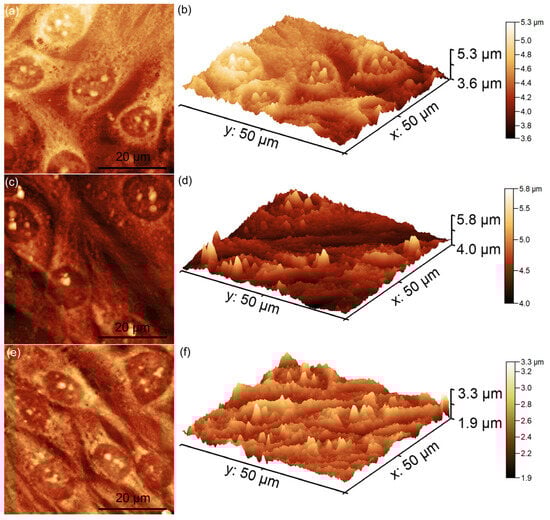 Two-dimensional AFM topographies of MG63 cells after 48 h of incubation with MgHApCs layers irradiated with 30 Gy (a) and immersed in RPMI for 7 days (c) and 14 days (e), as well as their 3D representations (b,d,f).
