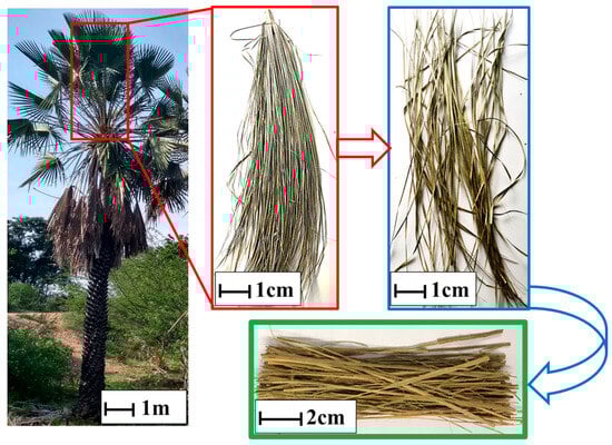 The carnauba fibers used in this work were acquired from rural production and came from the city of Barro, Ceará, Brazil. The material was made available in the form of leaves that were still green. The leaves were immersed in water for 24 h followed by drying in the sun for 12 h and then shredded. The carnauba leaves as received are illustrated in Figure 1 [11].