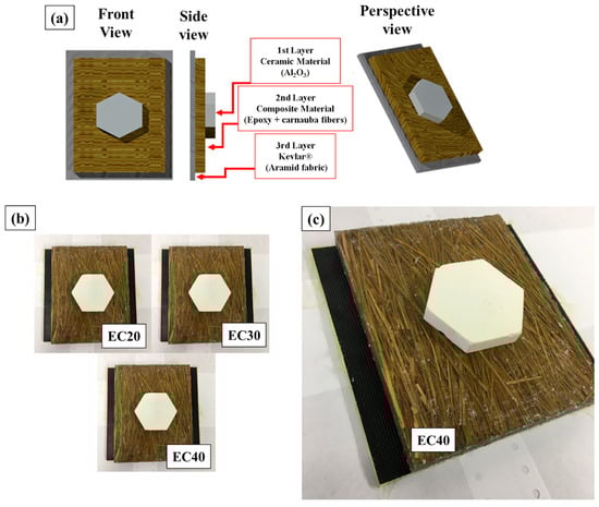 The test specimens for the multilayer ballistic test were assembled by gluing the constituent parts together (ceramic tile; composite; aramid fabric) with fast-curing polyurethane (PU) adhesive. The proposed model for multilayer shielding is represented in Figure 3a and the sample obtained in Figure 3b,c.