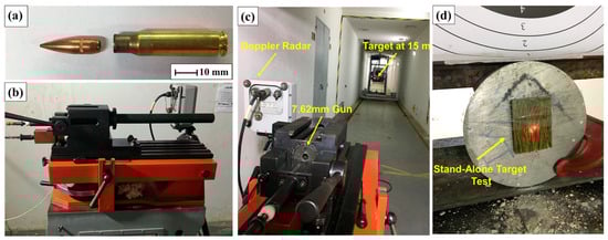 Residual velocity ballistic test setup. (a) 7.62 × 51 mm projectile, (b) 7.62 mm weapon, (c) setup test, and (d) epoxy–carnauba composite target.