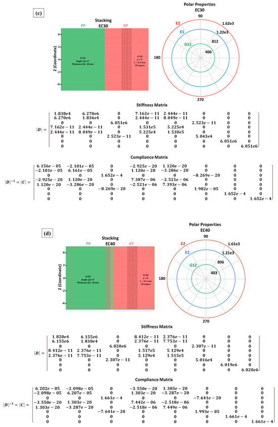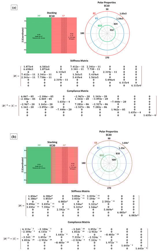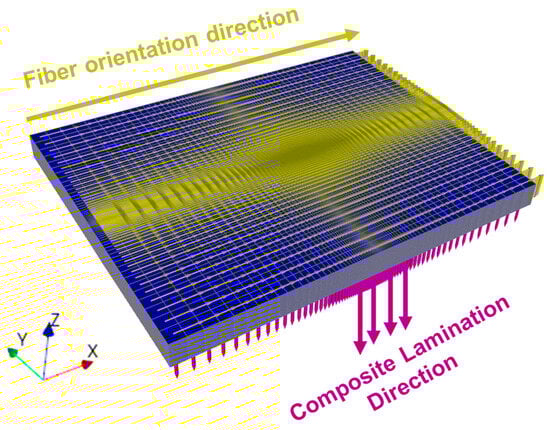 In the universe of composite materials simulation, two perspectives are available for obtaining properties: microscale and macroscale. Some studies have evaluated material properties through RVE, making it possible to understand on a microscale the properties that fiber-reinforced composites may present [20,21]. The implementation of RVE models is necessary in situations where experimental analyses to survey properties are generally unfeasible; thus, this approach acts as a provisional source for problem-solving via identifying the engineering constants of materials [22,23]. In the macroscale sphere, simulations of composite materials involve the assembly of sheets, which is a real challenge to be overcome. Different studies have been developed to survey these materials’ properties, including numerical simulation and assembly of the materials [25,26].