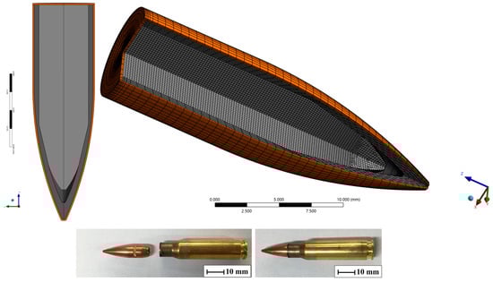 The JC model was applied to the steel and brass that comprised the projectile geometry. This model was used to describe the plasticity and fracture of both materials [34,35,36]. The parameters used in the model were those presented by other authors in accurate and reliable evaluations; the values obtained for steel and brass are presented in Table 2.