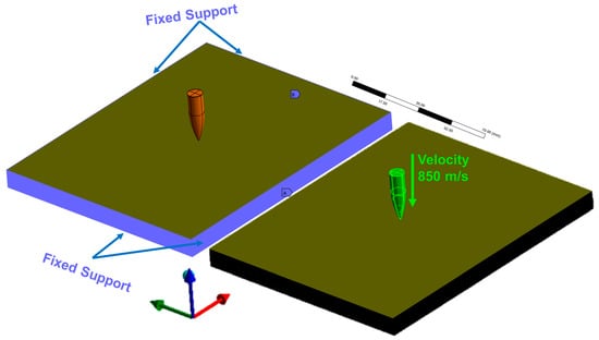 - Seidl, M.; Legendre, J.; Mehl, M.; Souli, M. Numerical Ricochet Model of a 7.62 mm Projectile Penetrating an Armor Steel Plate. In Proceedings of the 15th International LS-DYNA® Users Conference, Detroit, MI, USA, 10–12 June 2018; p. 11. [Google Scholar]