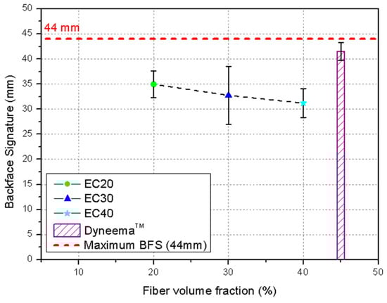 The lack of information regarding the properties presented by epoxy–carnauba fiber composites justifies the need to collect information regarding the ballistic properties of these materials. The search for the development of resistant materials that can be used in engineering applications is an extremely important factor for establishing a product that can replace synthetic materials such as aramid fiber (Kevlar® or Twaron®) at an equivalent level. Several composites reinforced with NLFs have been widely investigated as an alternative to replace conventional synthetic fibers [7]. The ballistic performance with a 7.62 mm projectile obtained in the present work was much superior to the Kevlar (58 J) reported by Monteiro et al. [28], highlighting the viability of the application of the composite evaluated in the present study.