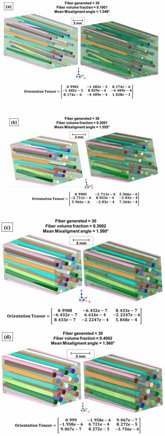 Some studies have included the assessment of material properties through representative volume element (RVE) models that make it possible to understand the properties that fiber-reinforced composites may present on a microscale [20,21]. The implementation of RVE models is essential when experimental analyses are unfeasible, serving as a temporary solution for problems such as determining the engineering constants of materials [22,23,24].
