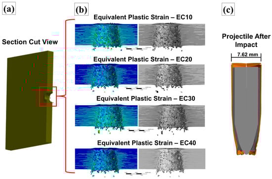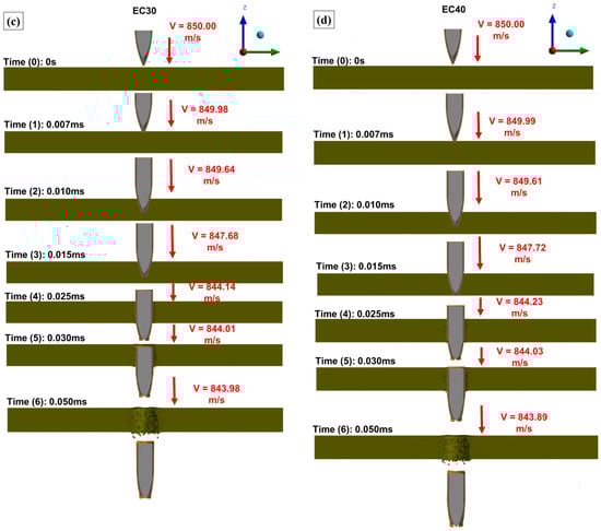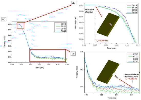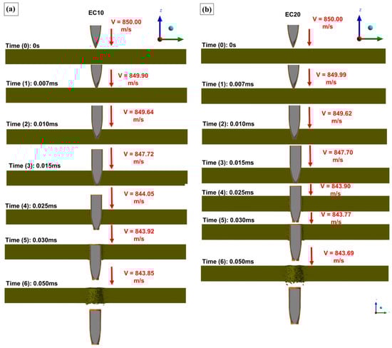 Figure 19b shows the contact forces on the target (CFT) and projectile (CFP) that occurred during the ballistic event, highlighting the position of the projectile in relation to the simulation times (T0, T1, T2, T3, T4, T5, T6). A contact time of 0.043 ms was identified, being the time elapsed from the beginning of contact (T0 = 0 ms; CFT = 0 N) of the projectile with the target until exit (T6 = 0.050 ms; CFT = 0 N). A sudden increase in the contact force was initially observed until the time interval T1 (0.007; CFT = 3617 N), at which time the projectile made contact with the target and promoted the first shear fractures; this increase in contact force represents the target’s resistance to penetration at instant T. At T2 (0.010 ms; CFT = 4807 N) there was a variation in the contact force; this characteristic indicates the passage of the sharp tip of the projectile as the thickest section of the projectile (side) comes into contact with the fractured region of the target. At T4, the greatest contact force was identified during the simulation process (CFT = 6922 N) at the point representing the largest area of surface contact between the projectile and the interior of the target. This time translated into the fracture of the last layer to be broken from the composite, after which there was a significant reduction in the target contact force [74,75]. At T4 (0.025 ms; CFT = 290 N) and T5 (0.030 ms; CFT = 49 N), rupture of the last layer of the composite had already occurred and the contact force between the projectile and the target translated into just the friction between the surfaces of materials. This fact highlights the decision taken to monitor this time interval as a residual velocity monitoring point.