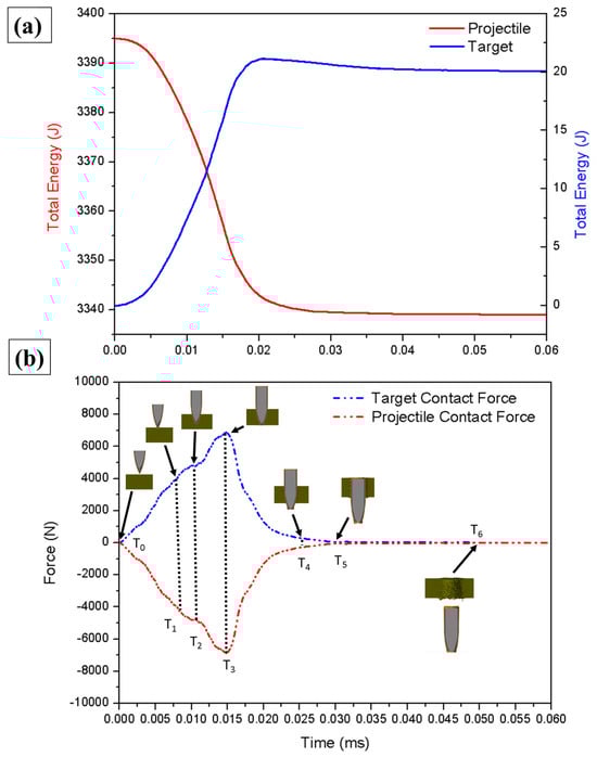 (a) Total energy in the target and projectile according to the simulation. (b) Graphs of contact forces generated on the target and projectile during the simulation.