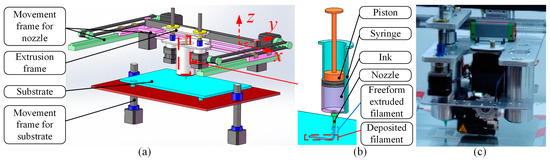 Description of the DIW process and deposited filament: (a) sketch of DIW process; (b) sketch of deposited filament; (c) picture of DIW process.