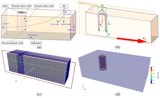 A commercially available MW-based ink, Nivea Crème Art. No. 80104 (Beiersdorf Global AG, Hamburg, Germany), is selected as the ink reference as it is the printability reference and representative for ink preparation and process parameter selection for DIW [41]. The material properties of the ink were obtained experimentally in our previous work [42] and are listed in Table 1. The initial condition of the phase fraction is shown in Figure 2d where the red region represents the ink and blue region represents the air, meaning that the ink is filled in the nozzle at the initial time. Finally, the 3D profile of deposited filaments is obtained through VOF by capturing the sharp front of the interface where the value of is 0.5. And the visualization of the deposited filaments is realized using the open-source, multi-platform data analysis and visualization software PareView (Version number: 5.12.0) [43].