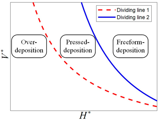 Yuk and Zhao [44], Comminal et al. [26] and Athanasiadis et al. [22] have summarized that the deposition and the profile dimension of the deposited filaments in MEAM are significantly influenced by the dimensionless nozzle velocity = (ratio of nozzle velocity to average velocity of ink in the nozzle ) and the dimensionless height = (ratio of distance between nozzle bottom and substrate to average dimeter of freeform extruded filaments ) where is the die-swelling factor, which describes the post-extrusion expansion of the ink. We divide the deposition statuses into three types: over-deposition, pressed deposition and freeform deposition. In the over-deposition status, excessive ink is extruded out beyond the outer diameter of the nozzle as the nozzle bottom is too closed for the substrate or the nozzle’s displacement velocity is too slow. In the pressed-deposition status, the as-deposited filaments are pressed by the nozzle bottom but the ink stays within the region of the outer diameter of the nozzle. In the freeform deposition, there is no contact between the nozzle bottom and the as-deposited filaments as the nozzle bottom is far away from the substrate or the nozzle velocity is too fast. Using the law of conservation of mass, the idealized dividing lines for over-deposition to pressed deposition and for pressed deposition to freeform deposition are expressed in Equation (13) and Equation (14), respectively. The two dividing lines are plotted in the − figure as shown in Figure 3 where the red dotted line and blue solid line represent dividing lines determined by Equation (13) and Equation (14), respectively.