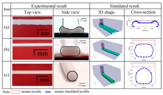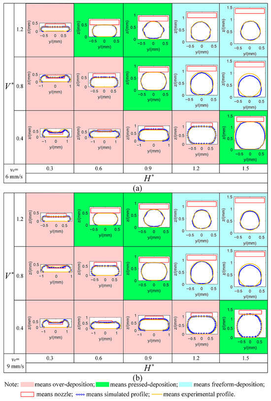 Simulated and experimental deposition statuses and profiles of the deposited filaments under different process parameters: (a) value of is set as 6 mm/s; (b) value of is set as 9 mm/s.