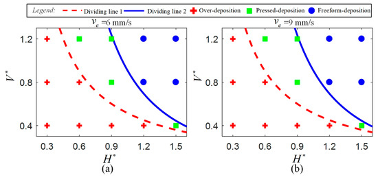 As shown in Figure 3, the deposition status can be determined by and for a certain ink, so that we are able to fully evaluate the effectiveness of the numerical prediction in the deposition status and to analyze the influence of process parameters on deposition status. First, is set as the two-level process parameter, which is 6 mm/s and 9 mm/s, to investigate the influence of on the deposition status. Then, at each level of , is varied from 0.4 to 1.2 at a fixed interval of 0.4 and is varied from 0.3 to 1.5 at a fixed interval of 0.3 to investigate the influence of and on deposition status.