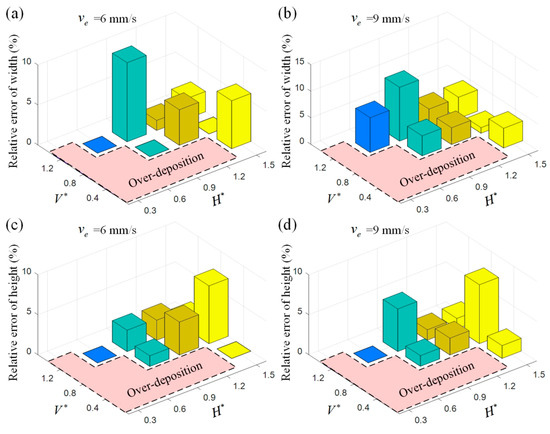 Relative error of the experimental and simulated profile dimension under different process parameters for (a) width when is set as 6 mm/s; (b) width when is set as 9 mm/s; (c) height when is set as 6 mm/s; (d) height when is set as 9 mm/s.