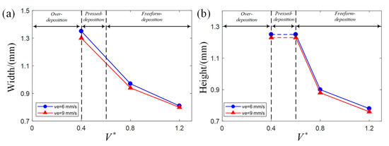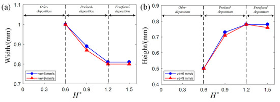 The combination of and influence the deposition status and profile dimension. In order to investigate the effect of and individually, one process parameter is set as a constant value while the other changes. As shown in Figure 8, to investigate the effect of individually, is set as 1.5 while changes from 0 to 1.2. As shown in Figure 9, to investigate the effect of individually, is set as 1.2 while changes from 0 to 1.5. The deposition status starts from over-deposition to pressed deposition and finally to freeform deposition when and increase as shown in Figure 8 and Figure 9. The effect of on width and height is influenced by its deposition status and is summarized as the width decreases with in pressed deposition and freeform deposition; the height remains the same with in pressed deposition but decreases with in freeform deposition. The effect of on width and height is influenced by its deposition status and is summarized as the width decreases with in pressed deposition but remains the same with in freeform deposition; height increases with in pressed deposition but remains the same with in freeform deposition.