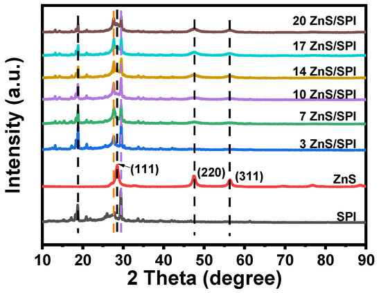 XRD patterns of SPI, ZnS, and ZnS/SPI composites.