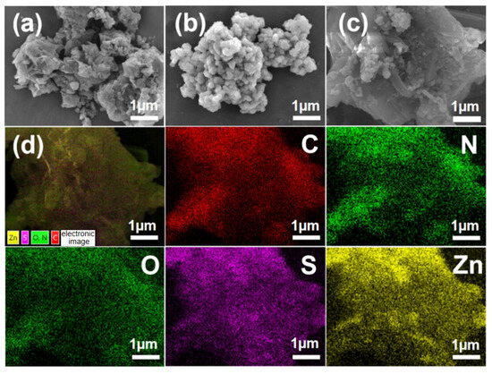 (a–c) SEM images of SPI, ZnS, and 14ZnS/SPI; (d) EDS mapping of C, N, O, S, and Zn elements for 14ZnS/SPI samples.