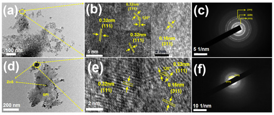 The images of (a) TEM, (b) HR-TEM, and (c) selected area electron diffraction (SAED) patterns for ZnS, and the images of (d) TEM, (e) HR-TEM, and (f) SAED patterns for 14ZnS/SPI composite.