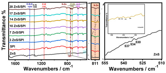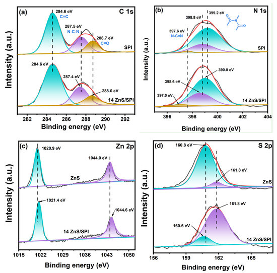 In addition, a distinctive spectral signature, denoted by a purple dashed line, appears at 636 cm−1, which corresponds to the fundamental vibrational mode of the sulfur–nitrogen (S−N) linkage. The spectral analysis reveals the characteristic signals of ZnS within the region of 525−540 cm−1 are found in the composites of 14ZnS/SPI, confirming the presence of ZnS. No new absorption peaks appeared in the 14ZnS/SPI system, but some of the absorption peaks underwent a significant displacement, which confirms the existence of the interaction between ZnS and SPI. Meanwhile, the analysis confirms that the structural integrity of SPI remained unaltered following the introduction of zinc sulfide nanoparticles, but formed Zn−N coordination bonds on its intersurface, which was conducive to the improvement of the photocatalytic stability of the composites [14]. It can also be seen from the figure that SPI has an absorption peak at 751 cm−1, but changes to two consecutive weak peaks in the composite, which is speculated to be due to the strong interaction between SPI and ZnS. A characteristic shift in the vibrational frequency from 811 cm−1 (pure SPI) to 808 cm−1 (composite) is observed, suggesting the establishment of coordinative Zn−N interactions. This phenomenon arises from the electronic coupling between the unfilled d-orbitals of zinc atoms and the electron-rich sp3 hybridized nitrogen centers, leading to a redistribution of electron density where zinc atoms become more electron-abundant while nitrogen atoms experience reduced electron density [39]. The presence of a strong chemical bonding between ZnS and SPI is verified. This robust interaction enhances the transfer of photogenerated charge carriers between ZnS and SPI through their intimate interface.