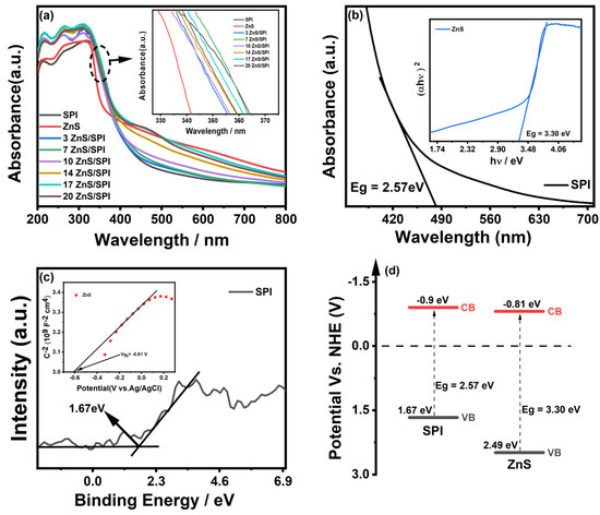 (a) UV−Vis diffuse reflectance spectra of SPI, ZnS, and ZnS/SPI. (b) Correspondence plot of (αhν)2 versus hν. (c) Mott−Schottky curve of ZnS and VBXPS of SPI. (d) The energy band structure diagram of SPI and ZnS.