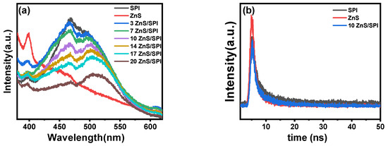 (a) Comparison of the photoluminescence spectra of SPI, ZnS, and ZnS/SPI composites; and (b) Transient PL decay spectra for pure SPI, ZnS, and 10ZnS/SPI samples.