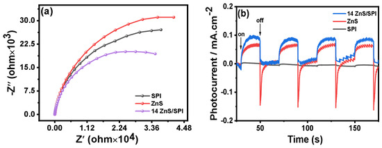 To systematically evaluate the electrochemical characteristics of the as-synthesized samples, the interfacial charge transport behavior of SPI, ZnS, and 14ZnS/SPI samples was investigated using electrochemical impedance spectroscopy (EIS) under dark conditions. According to the Nyquist plots in Figure 8a, the semicircular arc dimensions reflect the interfacial impedance between electrode and electrolyte, where decreased arc diameters indicate reduced interfacial charge-transfer resistance [51]. The incorporation of ZnS nanostructures into the SPI matrix minimizes the interfacial charge-transfer impedance. Notably, the 14ZnS/SPI composite exhibited the most efficient electron transport kinetics, suggesting that the engineered ZnS/SPI heterojunction architecture facilitates enhanced charge carrier mobility across the interface. The photocarrier dynamics and charge separation capabilities were evaluated through photoelectrochemical measurements under periodic light on–off cycles, generating transient photocurrent responses (i–t curves) for pristine SPI, ZnS, and the 14ZnS/SPI heterostructure. The photoelectrochemical data presented in Figure 8b reveals superior photocurrent generation by the 14ZnS/SPI heterojunction system, whereas pristine SPI exhibited minimal photoresponse under identical illumination conditions. This increase in photocurrent intensity is further evidenced by the fact that 14ZnS/SPI composites show higher light utilization as well as more efficient electron transfer. This phenomenon primarily originates from the improved optical response in the visible spectrum range by Zn vacancies in ZnS, which promotes photogenerated electron–hole separation [24]. In addition, the ZnS/SPI heterojunction structure also favors the charge transfer between ZnS and SPI.