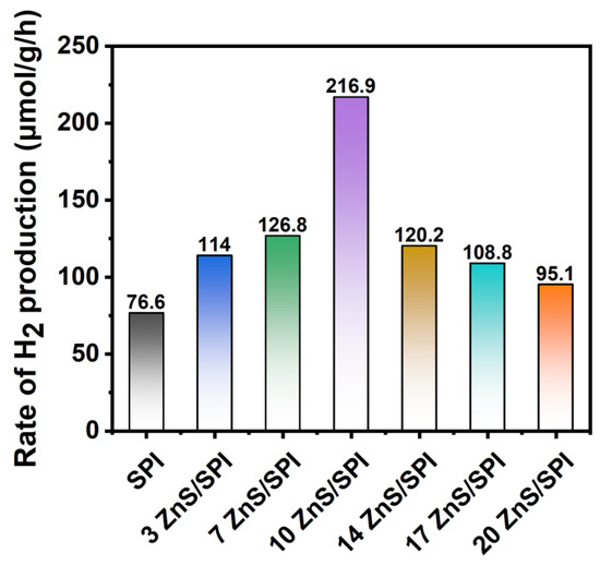 To examine the influence of surface-immobilized ZnS nanostructures, synthesized through in situ crystallization on SPI matrix, on the photocatalytic efficiency, different catalysts were tested for their photocatalytic hydrogen production activity under fully irradiated light using triethanolamine (TEOA) as a hole sacrificial agent. According to the previous literature, Zn vacancies are the key factor in improving the performance of visible light photolysis for hydrogen production from water [19]. The experimental results show that the photolytic water hydrogen production performance of the ZnS/SPI composite system is significantly better than that of SPI, as shown in Figure 9. It reaches the maximum value in the 10ZnS/SPI system, and then shows a decreasing trend. The relatively low H2 generation rate of 76.6 µmol/g/h for pure SPI is attributed to its limited absorption of visible light, poor charge transport ability, and small specific surface area [43]. The corresponding hydrogen production rates for 3ZnS/SPI, 7ZnS/SPI, 10ZnS/SPI, 14ZnS/SPI, 17ZnS/SPI, and 20ZnS/SPI were 114 µmol/g/h, 126.8 µmol/g/h, 216.9 µmol/g/h, 120.2 µmol/g/h, 108.8 µmol/g/h, and 95.1 µmol/g/h. The maximum hydrogen production rate was achieved on 10ZnS/SPI, which was about 2.8 times higher than the hydrogen production rate of pure SPI. The enhanced photocatalytic H2 evolution efficiency can be rationalized by the synergistic effects of increased visible-light harvesting capability and accelerated charge carrier separation, originating from the zinc-deficient sites within the ZnS lattice [19]. Meanwhile, the formation of the Z-type heterojunction structure of ZnS/SPI was utilized to promote the charge transfer at the interfaces between ZnS and SPI. Consequently, the enhanced photocatalytic efficiency manifests in accelerated H2 evolution kinetics, demonstrating substantially superior catalytic activity compared to pristine SPI.