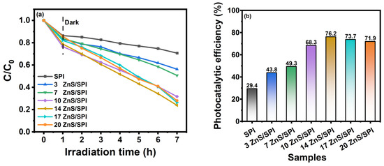 Considering the fact that methyl orange (MO) is a widespread organic contaminant, its good antioxidant and photolysis resistance make it a typical pollutant. Therefore, it frequently serves as a model system in photocatalytic degradation studies [52]. Therefore, to further evaluate the photocatalytic activity of SPI and ZnS/SPI composites, the photocatalytic performance of SPI and different ratios of ZnS/SPI composites were evaluated with the target of degrading 40 mg/L MO aqueous solution. From Figure 10a, it can be seen that the photocatalytic degradation activity is much higher in the xenon lamp simulated sunlight-driven compared to the dark case. Such a result suggests that the degradation of MO is indeed accomplished by the sunlight-driven catalyst. The results from Figure 10a show that the photocatalytic degradation activity of ZnS/SPI composites is gradually enhanced with the increase in ZnS content. And, the highest photocatalytic degradation activity of the 14ZnS/SPI composites was observed, and the degradation rate was 76.2%. Beyond this point, the continuous elevation of ZnS loading in the ZnS/SPI hybrid system resulted in a gradual decline of its photocatalytic efficiency towards pollutant decomposition. The primary reason lies in the suppression of solar light harvesting and photo-induced charge carrier generation caused by superfluous ZnS, resulting in reduced photocatalytic efficiency. [53]. Moreover, Figure 10b illustrates the comparative photocatalytic performance of SPI and ZnS/SPI composites towards MO degradation. The results demonstrate that all composite materials exhibited enhanced photocatalytic activity compared to pristine SPI. Notably, the 14ZnS/SPI composite displayed the most efficient degradation capability, achieving 2.6-fold higher activity than pure SPI.