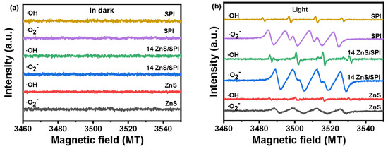 ESR spin trapping spectra of SPI, ZnS, and 14ZnS/SPI composites: (a) In dark conditions; and (b) Under lighting conditions.