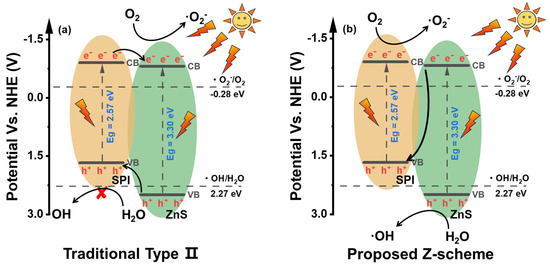 Schematic illustration of (a) traditional type−II heterojunction; and (b) direct Z−scheme charge transfer mechanism for ZnS/SPI system.