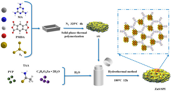 ZnS/SPI composites were synthesized by an in situ crystalline growth method. The prepared SPI was dissolved with zinc acetate dihydrate, thioacetamide, and polyvinylpyrrolidone (PVP) according to a certain ratio with an appropriate amount of ultrapure water and dispersed ultrasonically using an ultrasonic cleaner for 10 min. It was transferred to a magnetic stirrer at 80 °C and stirred into a suspension. Then, it was heated up to 180 °C at a rate of 2.5 °C/min in a reactor to carry out a hydrothermal reaction for 12 h. Finally, the crude product was further washed, dried, and milled. Based on the theoretically calculated ZnS mass ratios, a graded series of ZnS/SPI composite photocatalysts with precisely controlled loadings (3, 7, 10, 14, 17, and 20 wt.%) were fabricated via hydrothermal synthesis. For convenience, they were referred to as 3ZnS/SPI, 7ZnS/SPI, 10ZnS/SPI, 14ZnS/SPI, 17ZnS/SPI, 20ZnS/SPI, respectively. The amount of reactants used to synthesize ZnS/SPI samples is indicated in Table S1. The preparation process of ZnS/SPI composites is shown in Scheme 1.
