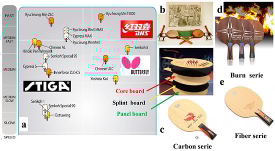As a renewable biomass material, wood is widely used in daily life and primarily serves engineering purposes [1,2]. Although various new buildings and decorative materials have been developed [3], wood remains irreplaceable in some specific areas of application, such as in music and sport fields, due to its unique mechanical [4,5], physical [6,7], and esthetic properties [8,9]. As one of the well-known Olympic games [10], table tennis has been a globally recognized sport for over 100 years, appearing not only in everyday life but also in international competitions. A table tennis racket is composed of table tennis racket blades (TTRBs), sponge, and rubber [11]. A TTRB commonly consists of a single layer of wood veneer, formed through gluing and compression molding [12,13]. More commonly, it is made from five-layer or seven-layer blades. The purpose of the singular plywood is to create a core layer at the center of the TTRB, referred to as the core board. The thickness of the core board typically ranges from 2.5 to 5 mm. On both sides of the core board, there are the splint board and the panel board, as illustrated in Figure 1a. The splint board, also known as the force material, has a thickness of 0.5 to 1 mm and is used to balance the force conduction between the panel board and the core board. The combination of the harder surface material and the softer force material enhances control performance during play, allowing for the better execution of various batting techniques. A thicker force material results in a faster ball rebound from the blade but reduces the ability to absorb the ball, leading to less control. The panel board is the thinnest layer, with a thickness ranging from 0.2 to 0.5 mm, and the selection and thickness of the materials for each layer play a crucial role in determining the overall softness and hardness of the TTRB. A TTRB is generally classified into two types according to the way of holding, i.e., the horizontal plate and the straight plate. The horizontal plate can be further divided into a straight handle and a waist handle. The straight racket handle is particularly conducive for fast attack techniques such as smashing, dunking, and slicing. In competitions, the waist-shaped handle is commonly used by athletes who specialize in fast-paced attacking play. This is because the front section of the racket’s bottom plate is thinner, while the tail is wider and thicker. This design provides athletes with a unique grip sensation, offering a balance of looseness and tightness, which enhances control and maneuverability during fast attacks. Since the end of the 19th century, the original TTRB was made of a paper material (Figure 1b) and has gradually evolved to incorporate canvas, glass sandpaper, and multi-layer natural wood [14]. Nowadays, with the emergence of new materials, as well as changes in game rules, athletes increasingly prefer lightweight and flexible TTRBs [15]. Manufacturer have improved the properties of TTRBs by adding materials such as a carbon layer (Figure 1c), man-made fibers (Figure 1e), and photosensitive resin to the blades [16]. Overall, the manufacturer’s innovation mainly focuses on three aspects: shape design, material matching, and adhesive development, but the breakthrough progress in these areas is very slow [17].