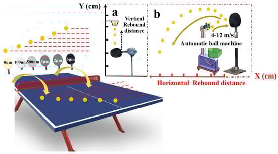 The surface structure of the treated samples was determined using X-ray powder diffraction (XRD, Philiphs, PW 1840 diffractometer, Kyoto, Japan), operating with Cu-K radiation at a scan rate of 4°/min, an accelerating voltage of 40 kV, and an applied current of 30 mA ranging from 5° to 80°. Non-contact surface profilometry (Wyko, Greenbackville, VA, USA) was used to calculate the surface roughness [54,55]. Viscoelasticity was measured using the DMA Q800 (TA, Newcastle, DE, USA) analyzer at room temperature. The single cantilever mode was selected, and the measurement was carried out on a rectangular cross-sectional bar with dimensions of 35 × 10 × 0.8 mm3 (L × T × R) [56]. Vertical rebound distance (Figure 2a) and dynamic rebound distance (Figure 2b) testing require the TTRB to be pneumatically fixed to the handle. The steps are as follows: Select 4 TTRBs as repeat samples; the weight of each TTRB must not differ by 5 g, and the total weight is within the range of 85~90 g. The weight of each ping-pong ball is controlled at 2.6~2.7 g. The serving speed of the table tennis machine is 4 m/s, 6 m/s, 10 m/s, and 12 m/s, respectively, and the test area is kept closed to reduce the influence of air flow on the test results. Each measurement was performed five times independently of one another.