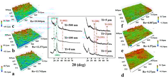 XRD spectra and 3D scan image of the surfaces of the pristine wood (a), (b–f) the Ti−treated wood with different deposition thicknesses of 100 nm, 500 nm, 1 μm, 2 μm, and 5 μm, respectively.
