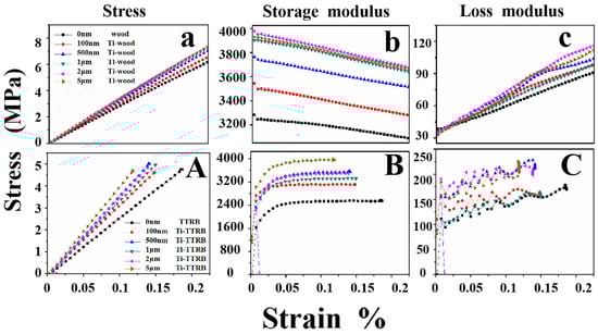 DMA curve of different thicknesses: the Ti–wood (a–c) and Ti–TTRB (A–C).