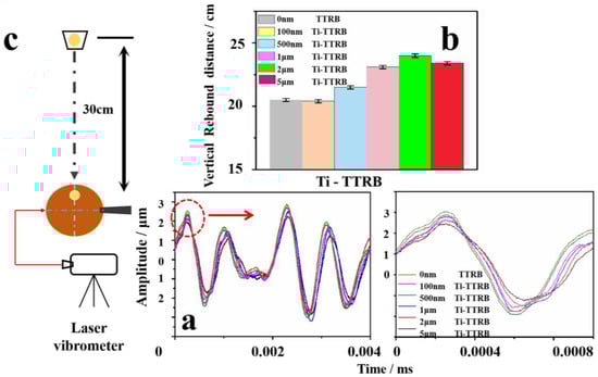 (a,b) Vibration curve and vertical rebound distance images of TTRBs with different thicknesses of Ti films. (c) The schematic diagram of ball and laser vibration measurement.