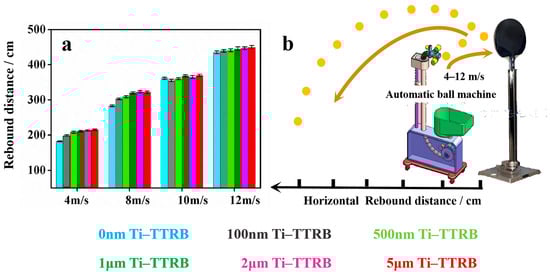 This test method simulated the actual use environment of the TTRB. The dynamic rebound device is shown in Figure 6b. The TTRB was hit by the table tennis ball at different speeds from an automatic ball machine. The same quality of table tennis balls was selected for the impact tests. Each test distance datum represents the average rebound distance of 50 balls. The height of the TTRB from the ground was 150 cm. The TTRB was fixed on a vertical countertop under a constant force. The test area remained closed to minimize the impact of air movement on the trajectory of the table tennis ball. Figure 6a shows the horizontal rebound distance (HRD), where the TTRB was hit by the table tennis ball at different speeds. When the ball hits the TTRB at a speed of 4 m/s, the HRDs of TTRBs with different Ti film thicknesses of 0 nm, 100 nm, 500 nm, 1 μm, 2 μm, and 5 μm were 182 cm, 198 cm, 208 cm, 211 cm, 213 cm, and 215 cm, respectively. The rebound distance increased due to the enhanced hardness of the TTRB provided by the metal Ti film. Meanwhile, when the ball speed was 8 m/s, the Ti-TTRB displayed the same advantage in rebound distance compared to the pristine TTRB. The rebound rates of the TTRB with five different Ti film thicknesses increased by 7%, 9%, 13%, 14%, and 13.7%, respectively. However, when the ball speeds were 10 m/s and 12 m/s, the effect of Ti film hardness on the improvement in the rebound distance of the TTRB was negligible. The main reason probably was due to the special structure of the TTRB. When the TTRB suffered a greater impact, the impact from the external delivery concentrated in the middle of the core board, causing all the energy of the TTRB to be activated (Figure S4). Although the metal film had a certain hardness, in a high-intensity application environment, the surface hardness could not enhance the overall hardness of the TTRB.