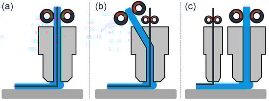Different methods of co-fiber (black) integration in fused filament fabrication (polymer depicted in blue): (a) extrusion of pre-impregnated continuous fiber filament, (b) separate feeding of fiber and filament with in situ impregnation, (c) dual-nozzle extrusion with separate nozzles for fiber and filament [15,20].