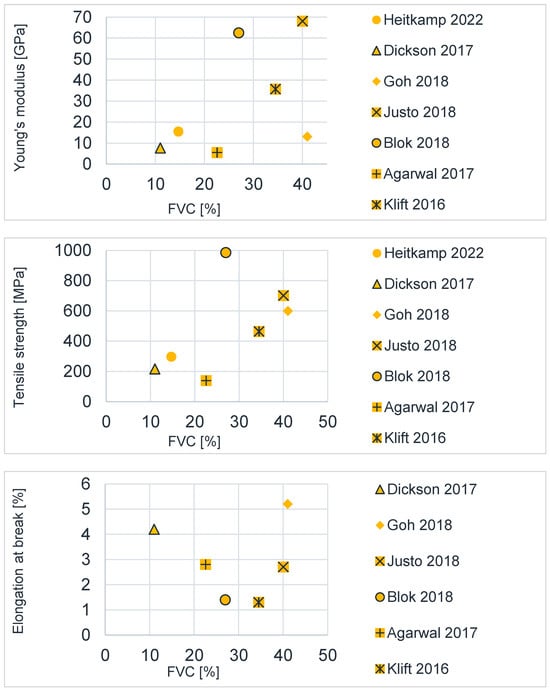 The Young’s modulus of CoFRP by FFF is contingent upon the fiber volume content (FVC) of the produced part. Figure 2 shows the values of the achieved tensile strength, Young’s modulus, and elongation at break for selected CoFRP produced via FFF. As can be seen, the mechanical properties increase almost linearly with increasing FVC, for which typical values range between 10% and 40% for additively produced parts. The observed variations in mechanical properties can be attributed to the utilization of distinct matrix or fiber materials, as well as variations in the quality of bonding between the fibers and the matrix. The pronounced anisotropy observed in FFF is primarily attributed to the inadequate adhesion of the polymer strands. During the extrusion process, a temperature gradient inevitably arises between adjacent strands, resulting in residual stresses and reduced adhesion of adjacent melt strands. In addition to the temperature gradient, geometric notches and, thus, defects are continually introduced into the component, which further reduces the component strength [31]. Consequently, FFF is primarily employed for prototypes [32].