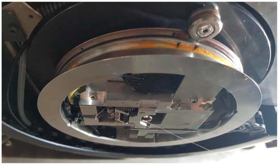 The system technology’s initial generation utilizes a module comprising a unit that rotates concentrically around the plastic discharge, thereby facilitating the conveyance of a fiber yarn (see Figure 3). The fibers conveyed under the plastic discharge are directly overprinted by the discharged plastic, thus becoming integrated into the component. The module’s primary functions include the alignment of the fibers and their subsequent conveyance. The separation of the fibers is achieved through a process of cutting with a blade at the edge of the discharging cannula [39]. In the subsequent generation, a fixed extrusion was employed for the fiber, while a movable and turnable table was utilized for the tool path. The implementation of reinforcing fibers is straightforward, as only the initiation of the fiber feed is required. With the appropriate orientation and dispensing speed, the fibers are automatically positioned correctly and can be integrated into the component by the plastic discharged through the Freeformer nozzle. The method for separating the fibers is more complex. To do so, the fiber roving, which is partially imprinted in the component, must be moved against its actual discharge direction so that it is bent around the edge of the cannula, broken in the process, and, thus, successfully separated. The efficacy of this separation method hinges on the stability of the fiber’s position within the discharge unit and the component. The presence of rubberized feed rollers serves to prevent slippage, yet the possibility of fiber peeling off the component remains if the force acts in a direction counter to the implementation. To address this, the fiber implementation module is rotated 180°, and the build platform is moved a predetermined distance in the direction of fiber discharge set before the rotation. This ensures that no peel forces act on the implemented fiber. The polymer used in this research is ABS Terluran GP35 (INEOS Styrolution Group GmbH, Frankfurt am Main, Germany), chosen for its technical relevance. As fiber material, an E glass fiber yarn (type EC9-34Z28 34 tex) (FULLTECH FIBER GLASS CORP., Taipei, Taiwan) is used. For better processability, it is coated with PERICOAT AC 250 (Textilchemie Dr. Petry GmbH, Reutlingen, Germany) at the DITF Denkendorf; the additional application is 12.5% based on the fiber weight.