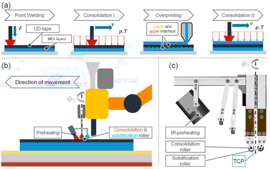 Given the necessity of alternating between the MEX with the DES and the consolidation process step, a hybrid end effector was developed (see Figure 4b). Thermal simulations have demonstrated that dynamic preheating is essential for consolidation [15]. Consequently, an infrared (IR) heater with a temperature control loop was constructed (see Figure 4c). The consolidation tool comprises a heated roller and a non-heated solidification roller. The presence of the latter is intended to briefly maintain pressure after the actual consolidation and, thereby, avert deconsolidation of the still-warm FRP.