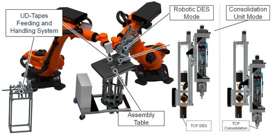 The robotic system developed for the process is depicted in Figure 5. The system principally consists of two industrial robots with suitable end effectors, a UD-tape feeding unit, and a heated table with parallel kinematics as a workspace. The right robot handles the hybrid end effector, which can quickly switch between DES and consolidation modes. The left robot is equipped with a heated gripper that is used to handle and form the UD-tapes [45]. The UD-tapes, which are provided in the appropriate length by an automatic feeding unit with a cutting mechanism, are then consolidated using a pneumatic pressure control consolidation unit that enables a defined force to be applied during the consolidation process.