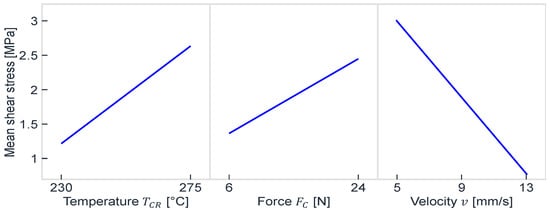 Figure 6 shows the main effects for the process step Consolidation I (see Figure 4a) for a 22 × 31 experimental design. In each instance, eleven samples were produced for each factor-level combination, ensuring the attainment of substantial results due to the high degree of scatter present. The factor levels encompassed the two consolidation temperatures (TCR), the two consolidation forces (FCR), and the three consolidation velocities (v), as illustrated. The specific values for the factor levels, and consequently the process window, were ascertained through preliminary studies. Particular attention was paid to the maximum values for the consolidation temperature and the force to ensure that the composite was not damaged. A velocity of 5 mm/s was selected so as not to make the process unnecessarily long. As can be seen, the consolidation velocity has the greatest absolute effect within the permitted process window, if one looks at the increase in mean shear stress from 13 mm/s to 5 mm/s. A low-consolidation velocity enables the consolidation roller to maintain pressure in an area for an extended period, thereby allowing the MEX layers’ polymer chains and the UD-tapes’ matrix sufficient time to interdiffuse. In principle, a lower consolidation velocity could be selected to enhance the consolidation outcome, provided that the process duration is acceptable. The consolidation force exerts the least influence, as the upper limit of the process window was set relatively low to prevent damage to the composite.