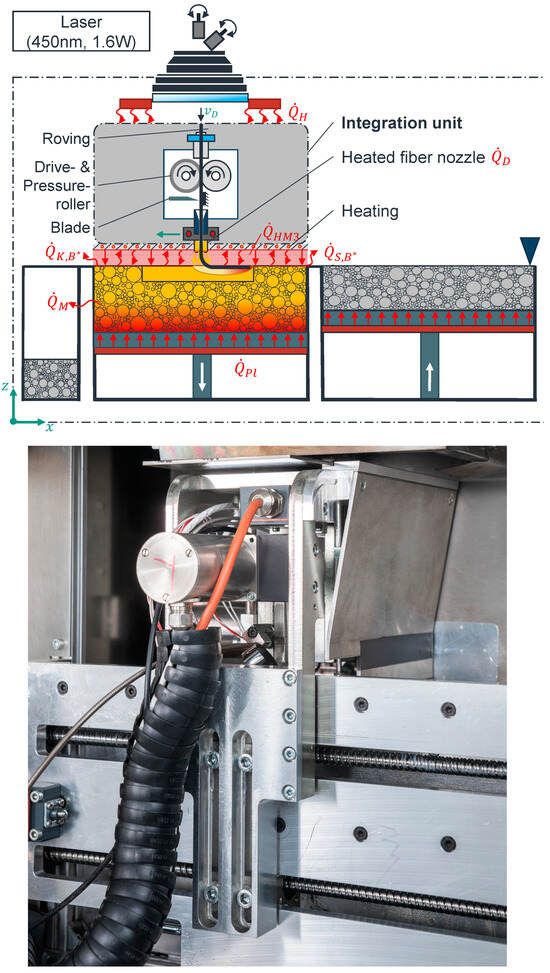 As illustrated in Figure 8, the fiber integration unit comprises a roving extruder, equipped with a step motor and a drive roller that facilitates the downward feeding of the roving into the designated direction. It also incorporates a pressure roller, ensuring a slips-free feeding process, and a cutting blade that precisely cuts the roving. Additionally, an auxiliary heat source positioned at the base of the fiber integration unit is utilized to maintain the component and powder bed surface at a specific temperature within the process window. The latter is composed of a black-painted metal sheet and a glued-on silicone heating mat. The fiber nozzle is heated by a heating element [6]. The fiber integration unit moves over the start point of the first roving path for integration of the roving in a user-defined layer. During the entire duration of the roving integration, the IR radiation and the measuring cone of the pyrometer are blocked by the fiber integration unit. Consequently, the supplied heat flow of the IR emitters is rendered ineffective. The built-in diode laser is kept inactive during the roving integration. To prevent the component or powder bed surface from cooling, the component or powder bed surface is maintained at a suitable temperature within the process window by the heat source located on the underside of the fiber integration unit.