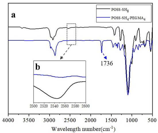 Typical FTIR spectra of POSS-SH8 and POSS-SH4-EG4 (a) and amplification of the –SH position (b).