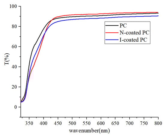 The difference in transmittance of the three samples was tested by light transmittance. As shown in Figure 3, the average penetration rate of the uncoated blank polycarbonate (PC) was 89.0%, while that of the N-coated PC was 90.2% and the I-coated PC was 85.9%. The reason for the increased transmittance of N-coated PC was that the PEGDMA coating covers the particles and crack defects on the substrate, and the surface becomes smoother and smoother. The reduced light transmittance of the I-coated PC was due to the certain aggregation of modified POSS in the coating, resulting in side effects such as scattering of light. Even so, its light transmittance was more than 85%, and the transparency was still perfect.